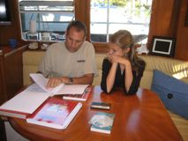 Hi everyone! Lately I have received a lot of questions about how homeschool works on the boat, so I decided to dedicate a blog to my school day aboard Three@Sea. I always try to do school first thing on the boat, so I get up, have a cup of tea, and then get right down to work down in the salon. At the beginning of the year I get a big box of books with EVERYTHING I need for a 160-lesson school year, with eight tests. I literally mean everything: books, lesson manuals, tests, answer keys, work books, supplies — everything. The following subjects make up my curriculum: